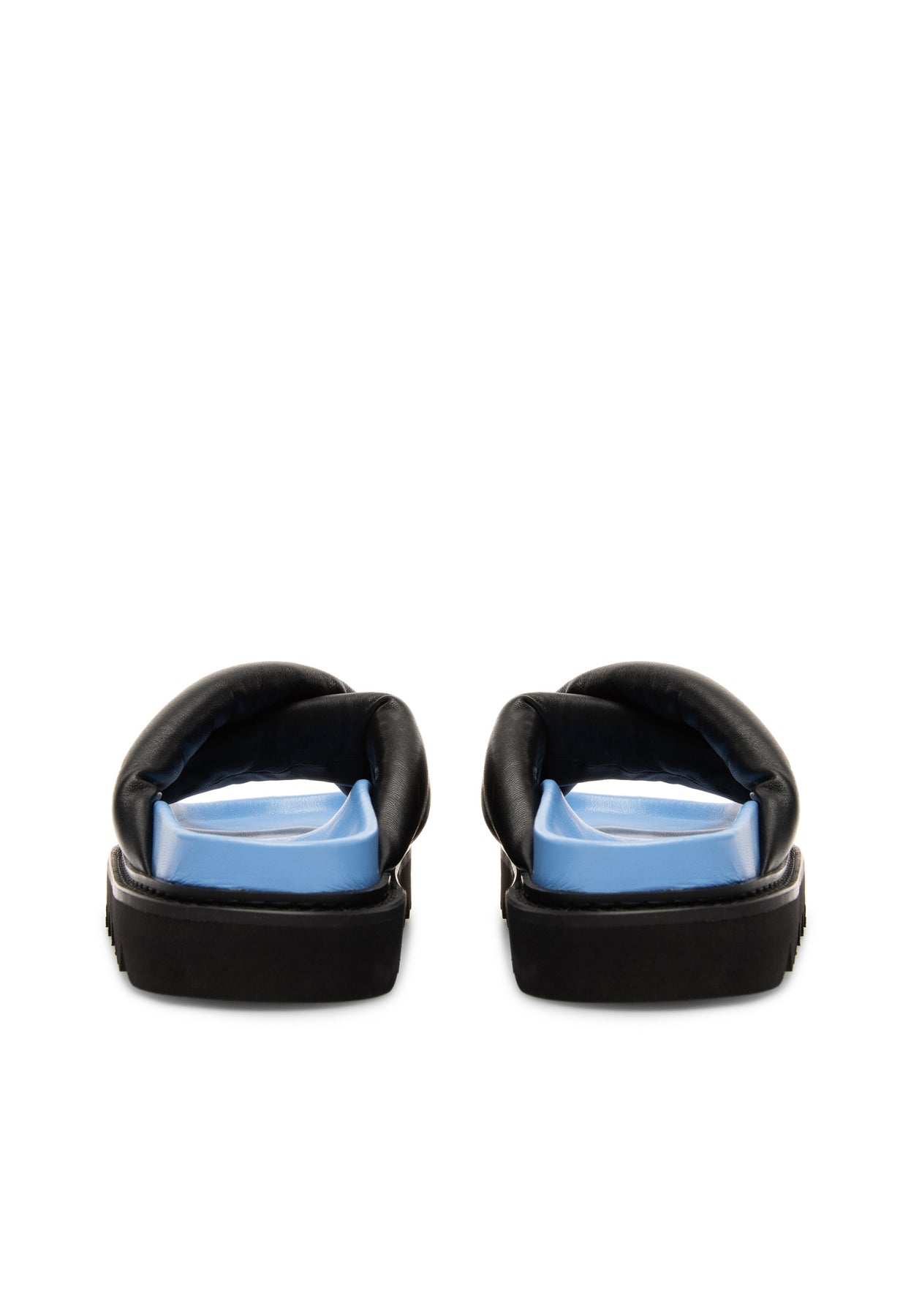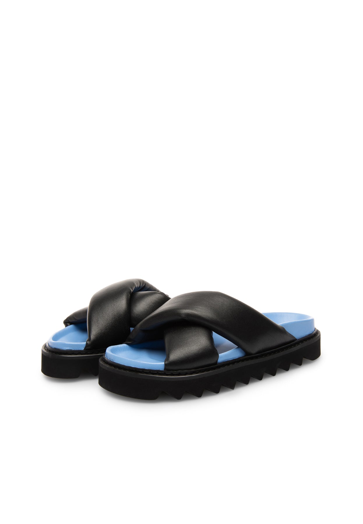 Padded cross strap sandal.with an ultra light,chunky looking EVA outsole with a shark toothed profile and top stich along welt. Footbed is in contrast color.